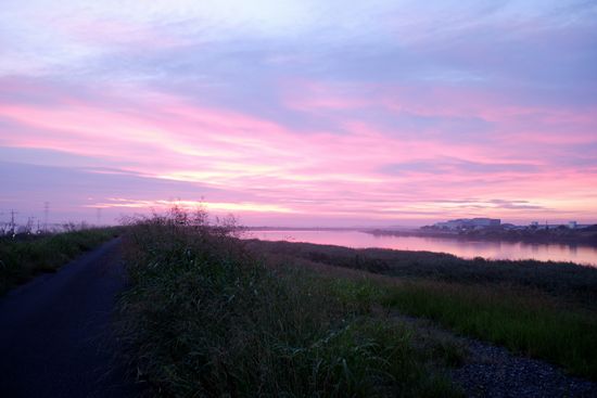 若草大橋から利根川左岸の自転車道を東に向かいます。長豊橋近くで、素晴らしい朝焼けを見ました。
