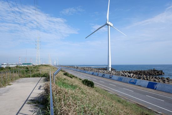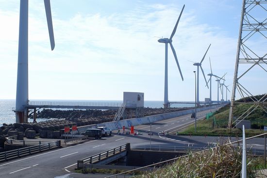 海に出ました。ここは、おくのやはま橋です。風車が連なっています。
