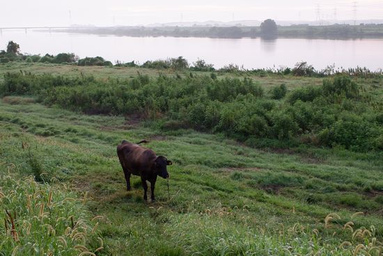 常総大橋手前、早朝というのに、河川敷に牛がいました。