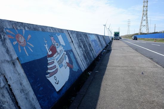 これが絵が描かれた防波壁です。車線と壁のあいだに広いスペースがあるので、車を気にする事無く