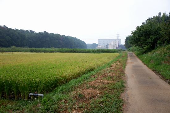 やがて谷津の奥に、工場或いは倉庫かな?が現れます。上高野(村上)工業団地の一角です。