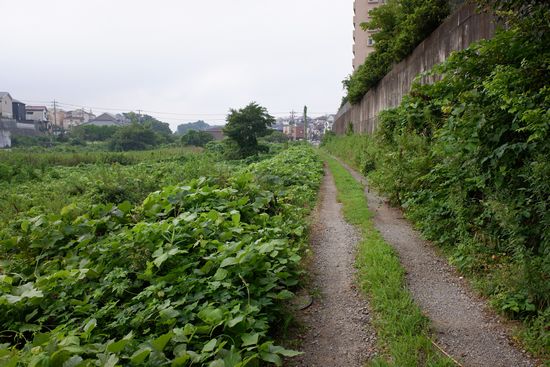 谷津道を進むと、道は上の写真の工場下(日商グラビヤ駐車場)に出ます。その先は写真のごとき