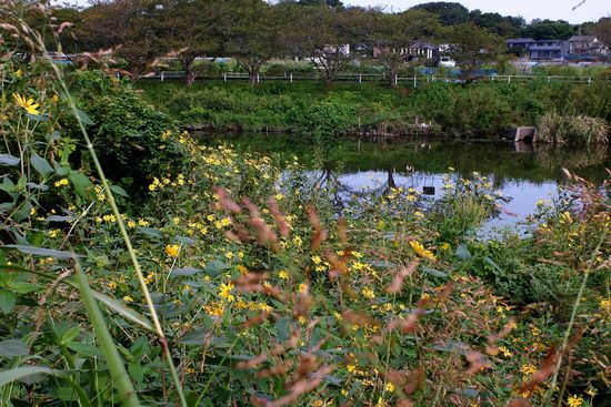 この季節、河川敷に黄色い花の群生が目立ちます。オオハンゴンソウです。