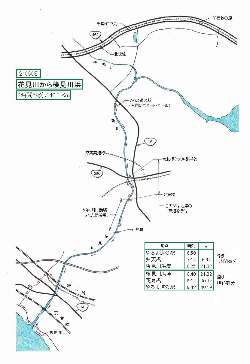 今回、娘同行で花見川から検見川浜を往復しましたが、家からではなく、やちよ道の駅からの発着としました。