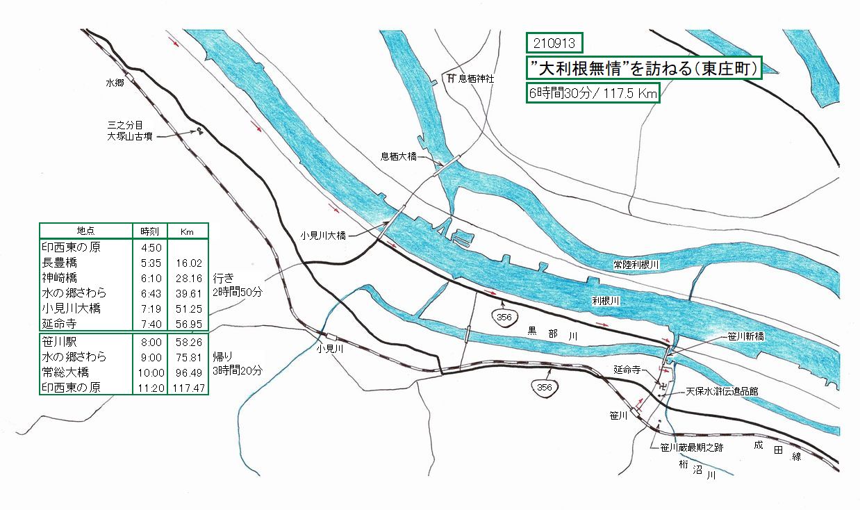 さて、帰りはモードを”のんびり”に切り替えて、土手を走っていると、左手に、2019年に訪れた三之分目