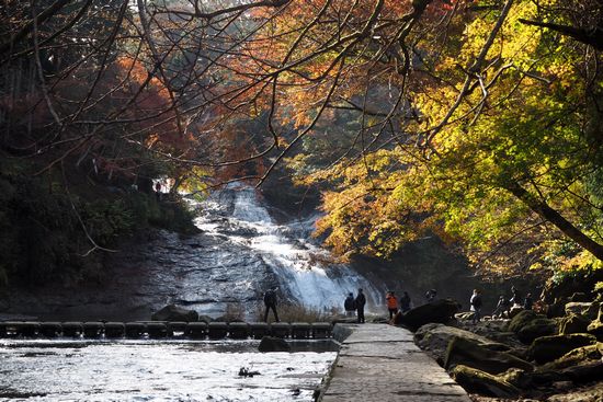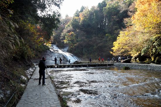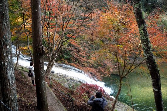 遊歩道を下って、粟又の滝下にきました。平日ですが、観光客多数。