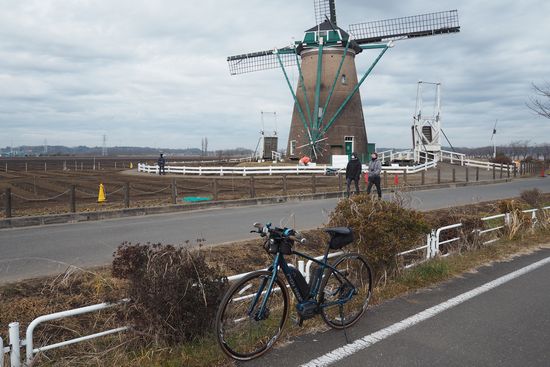 佐倉ふるさと広場の風車を通過します。周りの畑には人が入って作業中でした。これからチューリップ
