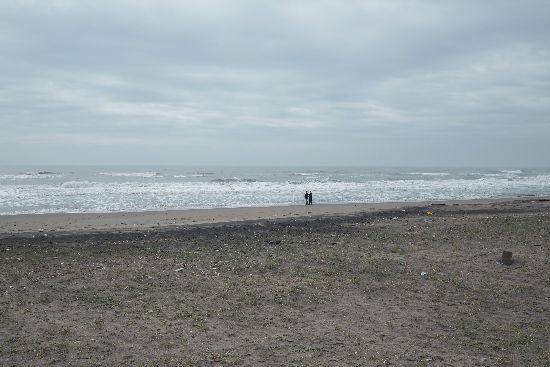 暗くて波の高い日でした。二人の人物は釣り人です。
