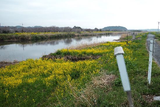 新井橋で栗山川を渡ります。岸辺の菜の花は満開でした。