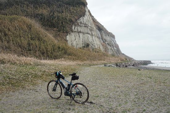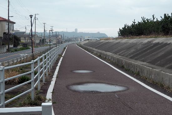ので、護岸沿いのサイクリングロードに移ります。前方に刑部岬が見えています。