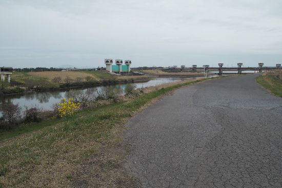 戸田井橋を過ぎ、北浦川水門(中央)と豊田堰(右側)を見る。