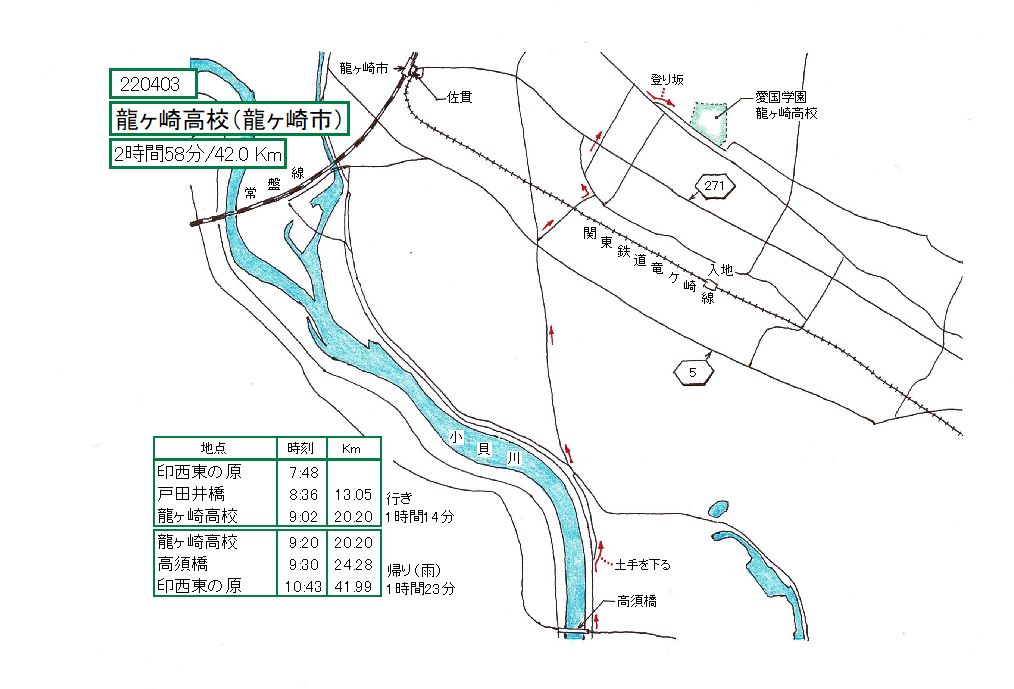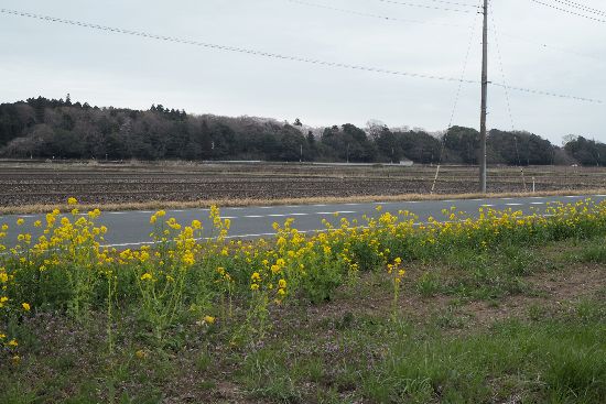 県道271号まで来ました。向こうの丘の上に桜の群生が見えています。あれが龍ヶ崎高校でしょう。