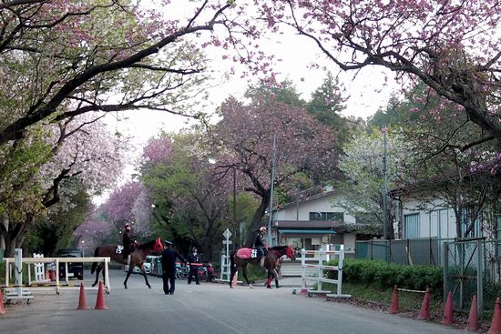 早朝の小林牧場を通過すると、馬場で運動した馬が道路を横断して厩舎に戻るのを見ること