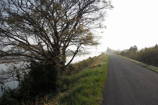 若草大橋北詰めから河内町方向。地表を霧が覆っています。