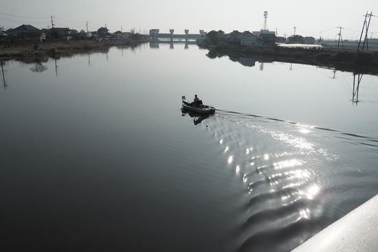 国道125の新利根橋から下流方向。画面中央に河口水門が見えています。