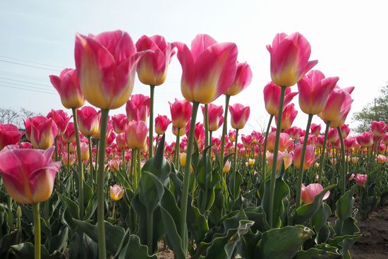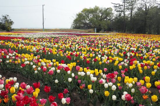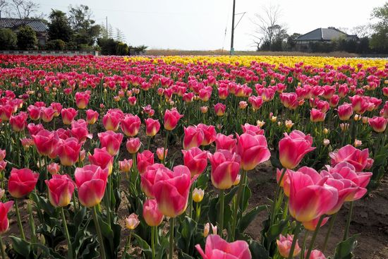 これはもう一カ所のチューリップ畑。色毎の植え付けなので、きれいな縞模様です。