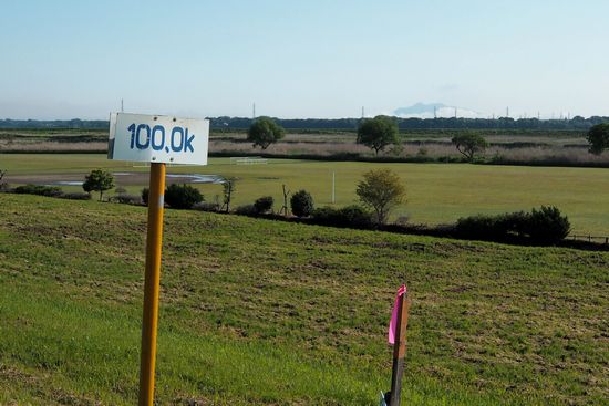 ゴルフ場ひばりコースを過ぎたところ。海から100Km地点です。
