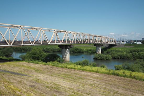 白い鉄骨の橋が見えてきました。芽吹大橋です。