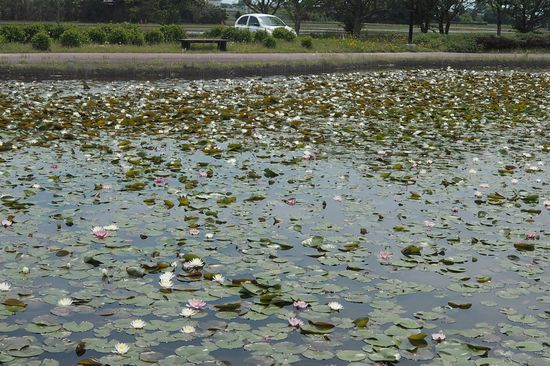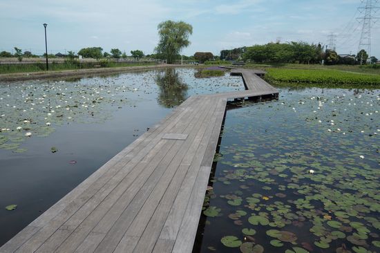 親水公園は、池の中に木道が通っています。水面に白い点々が見えますが、睡蓮の花です。