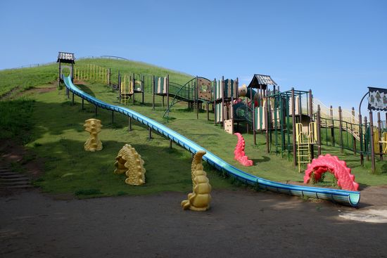 たつのこ山の北斜面には、斜面を利用した遊具が設置されています。長い滑り台がありますが、