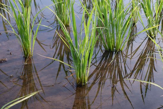 稲苗をアップで撮ってみました。田植え直後より、ずいぶん確りとしてきました。田んぼの水面が