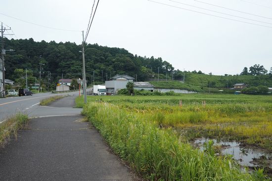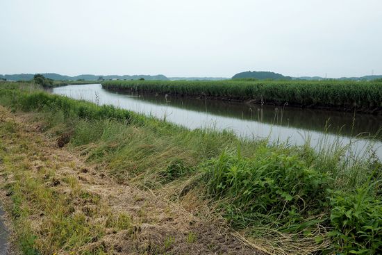 栗山川をそのまま下って行きます。遠くに島のような山がありますが、あそこには城跡があります。