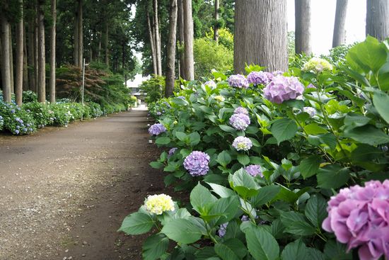 山門から本堂まで、杉木立の中の長い参道があり、両側にアジサイが植えられています。