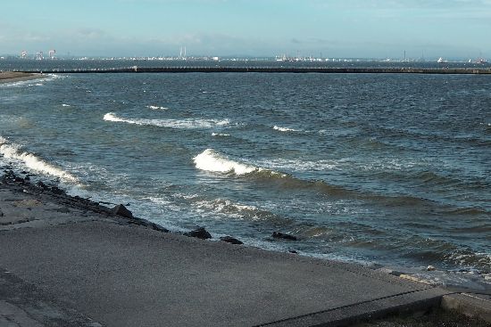 3月に来たときは、べたなぎの東京湾でしたが、今日は強い南風で波立っています。
