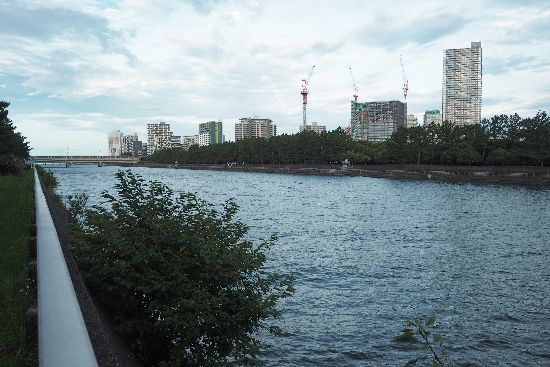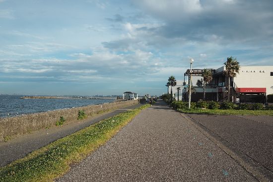海が近付くと、高層マンション群が現れます。散歩やジョギングの人も増えます。
