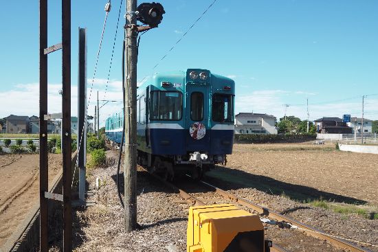 灯台から銚子ドーバーラインに向かいます。途中の踏切で銚子電鉄の通過を待ちます。