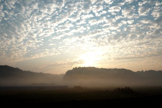 朝靄の師戸川谷津道を行きます。秋の空ですね。