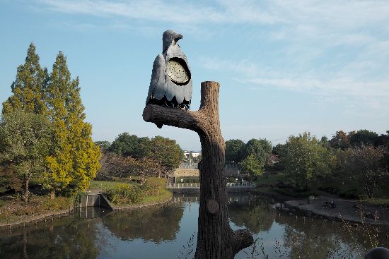 鳥のモニュメントと大池。何の鳥でしょうね。