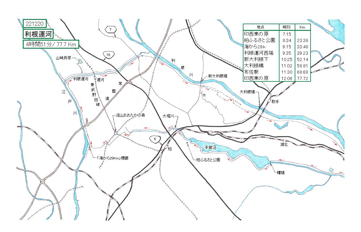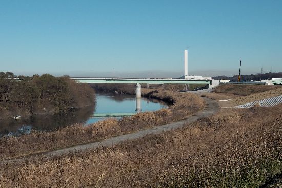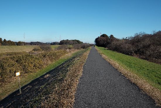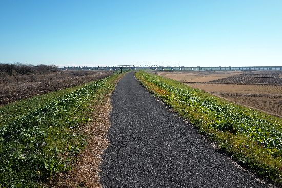 途中の越流提までは土手の上。そこから土手を降りて2号排水路の側道を大利根橋へ、と