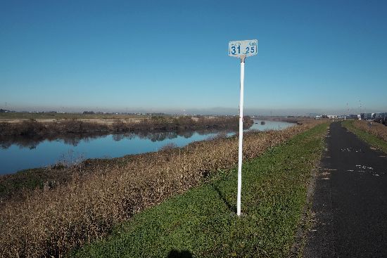 美しい江戸川の流れ。海から31.25Kmの標識。なんで0.25Kmの端数を付けるんでしょうか?