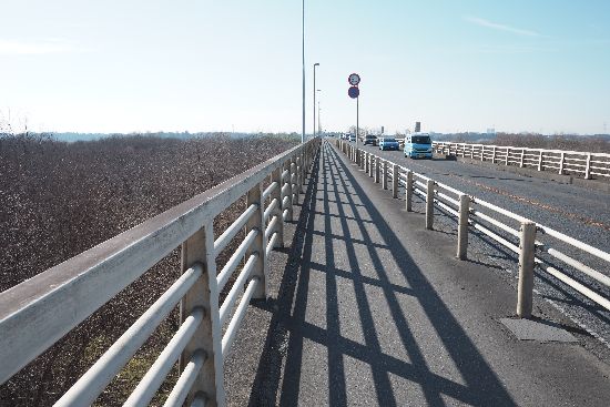 長い新大利根橋を左岸から右岸へと渡ります。手摺の格子状の影が歩道に映っているのが