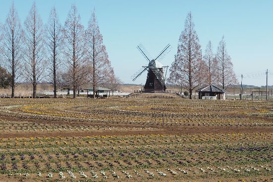 あけぼの山農業公園の風車前の花畑です。春はチューリップ、夏はヒマワリ、秋はコスモスに