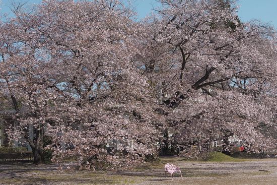 かなりのボリュームの桜の下に、桜色の椅子が一脚。あそこに座ると、桜色の夢を見られそう。