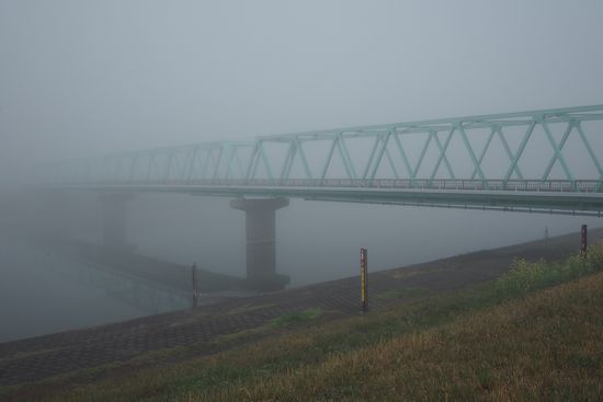 霧の中の高須橋。ところで、霧の中では水滴で視界が曇るので、サングラスは使えません。