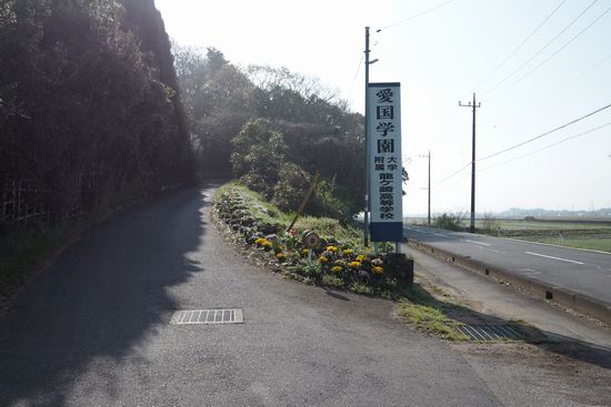 道は稲敷台地に突き当たります。愛国学園の案内標識に従い、坂を登ります。