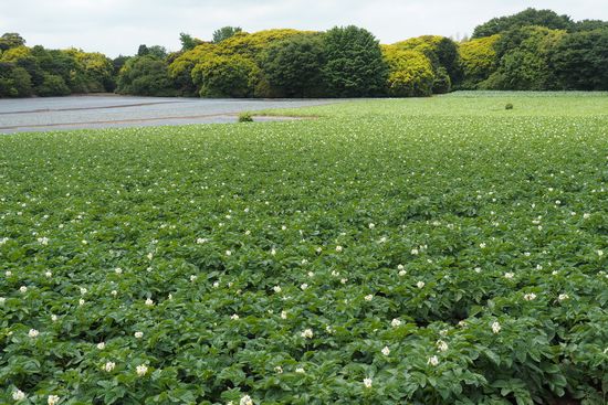 さて、最後の写真は三里塚近くのじゃが芋の畑。点々と咲く花は鑑賞に堪えます。芋の畑は