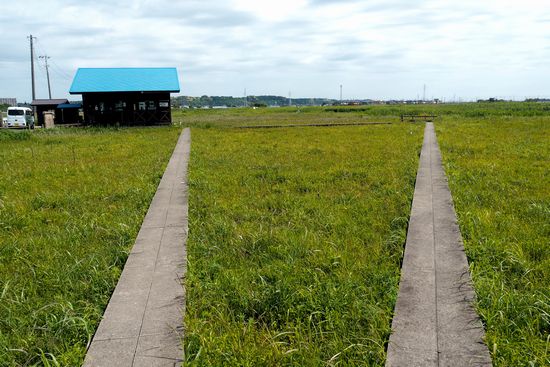 管理棟と湿原内の遊歩道。巾は狭いので、先行者がいたら追い越せませんね。また、直立した目線