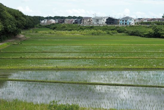 ここは家まで1.7Km地点。下は、亀成川の最上部の水田です。宅地が谷津ギリギリまで迫って