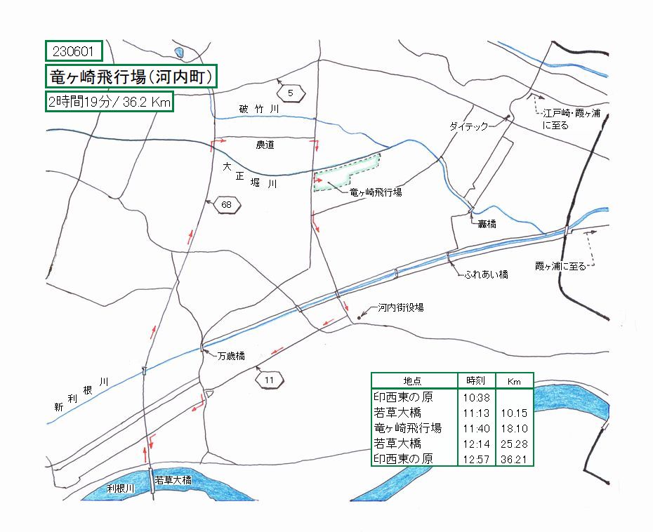 農道からR68(旧道)に出ました。大正堀川の橋の上から竜ヶ崎飛行場を望む。