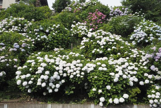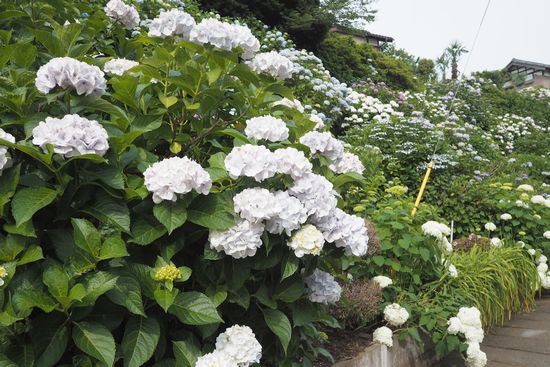 道路の片側が住宅。対面が斜面で、あじさいが植えられています。