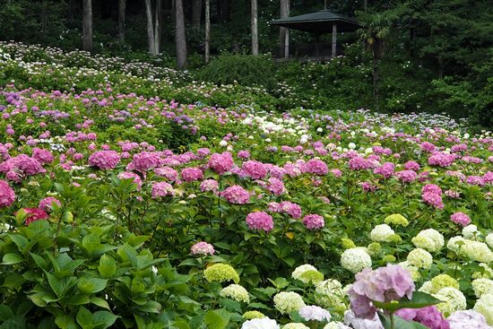 行って見ての感想ですが、行っただけの事はありました。山の斜面を埋め尽くした色とりどりのあじさいは、それは