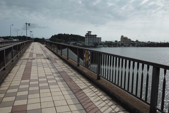 潮来大橋を渡ります。対岸の画面中央のビルは、ホテル新まこも。その左の亀の甲状の岡の上