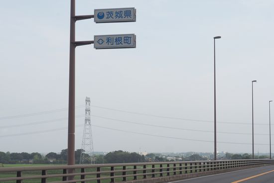 若草大橋の中間部。茨城県、利根町の看板が現れます。