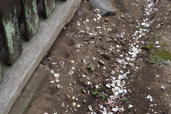 立木貝塚という縄文遺跡の上に鎮座されています。よって境内至る所で、縄文時代の貝殻を見るこ