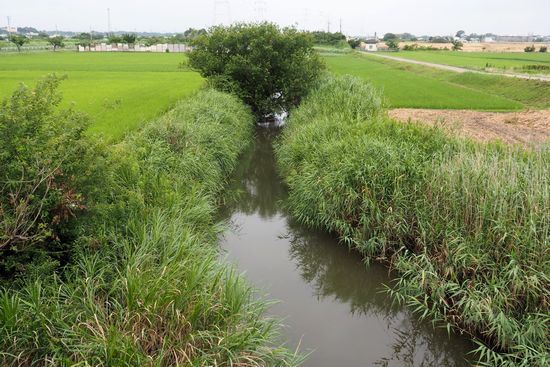 新利根川もだいぶ上流に来て、小川になってきました。遠くに利根川土手が見えています。この川