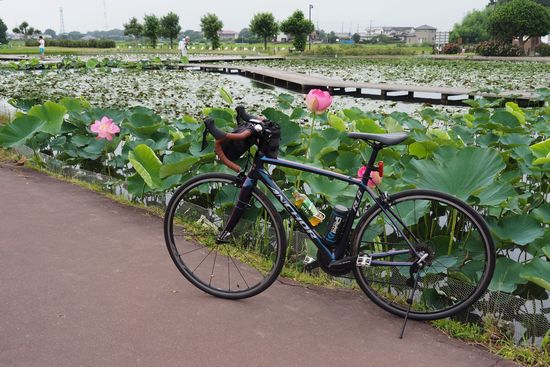 親水公園に着きました。3輪咲いていた蓮の花の前で記念撮影。